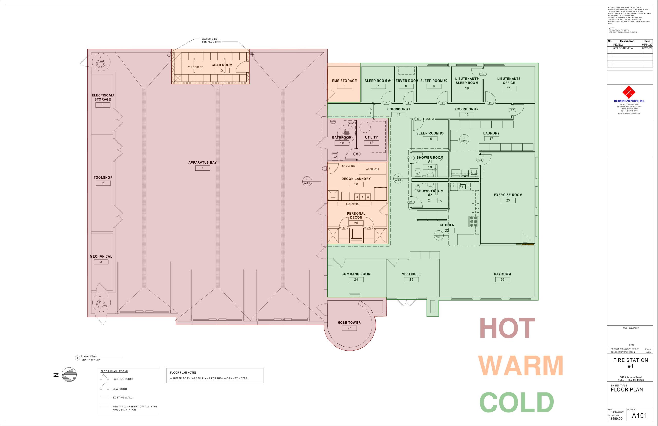 Redstone worked with the City to create a project scope and plan that would work within the City’s tight budget, and provide the stations with the necessary spaces to work efficiently and safely for now and in the future. The project scope includes the addition of sleep rooms and Hot, Warm, and Cold spaces. The Hot, Warm, and Cold spaces have been separated with not only walls and doors, but with the mechanical systems that allow these spaces to be free of harmful carcinogens. In addition, the male and female locker rooms have been converted to unisex shower rooms to better provide for staffing regardless of gender or sexual orientation. The project is currently in construction.